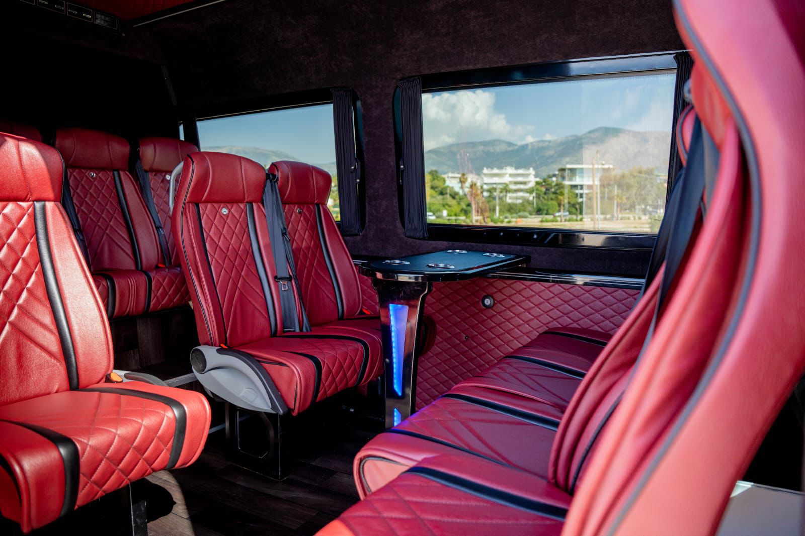 The luxurious red leather interior, diamond-stitched seats and elegant ambient lighting create an exclusive atmosphere, while the spacious cabin layout ensures maximum comfort throughout your journey. The onboard table setup makes it ideal for corporate transfers, small private groups, families and VIP guests.